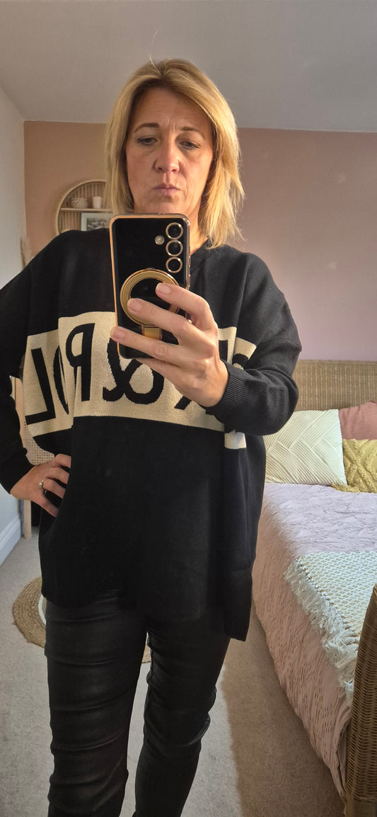 Roxy Jumper – Black V-Neck with Metallic Thread Detail