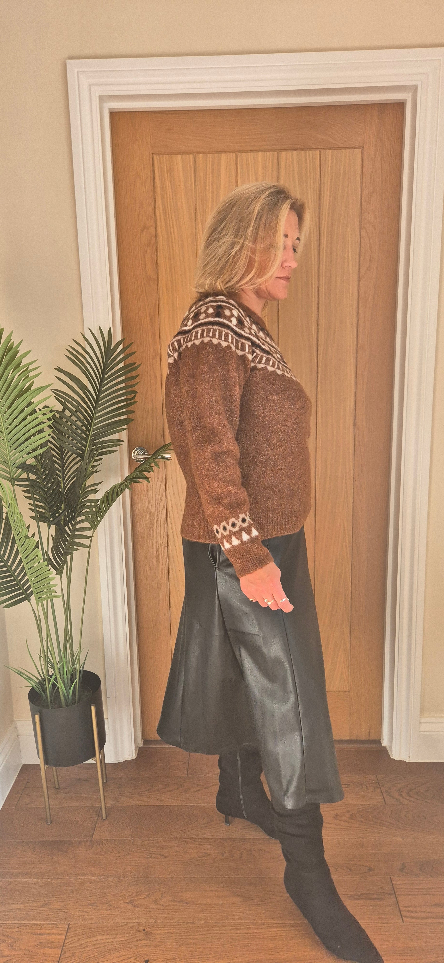 Add timeless charm to your winter wardrobe with the Cherrie Sweater, featuring an on-trend Fair Isle knit design. Available in two chic colourways — classic oatmeal or rich tobacco — this cosy jumper is perfect for seasonal layering.