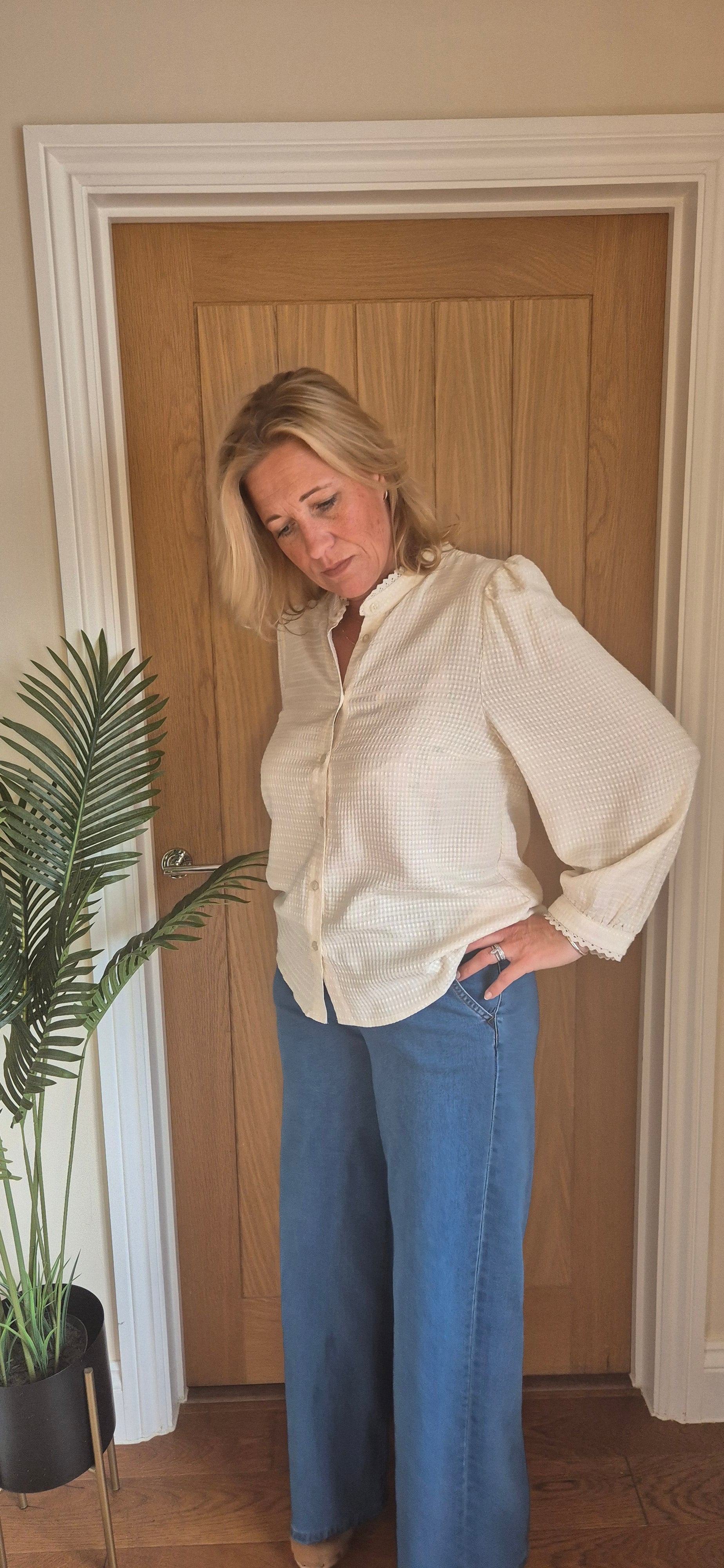 Nella Blouse – Cream High Neck with Lace Edging