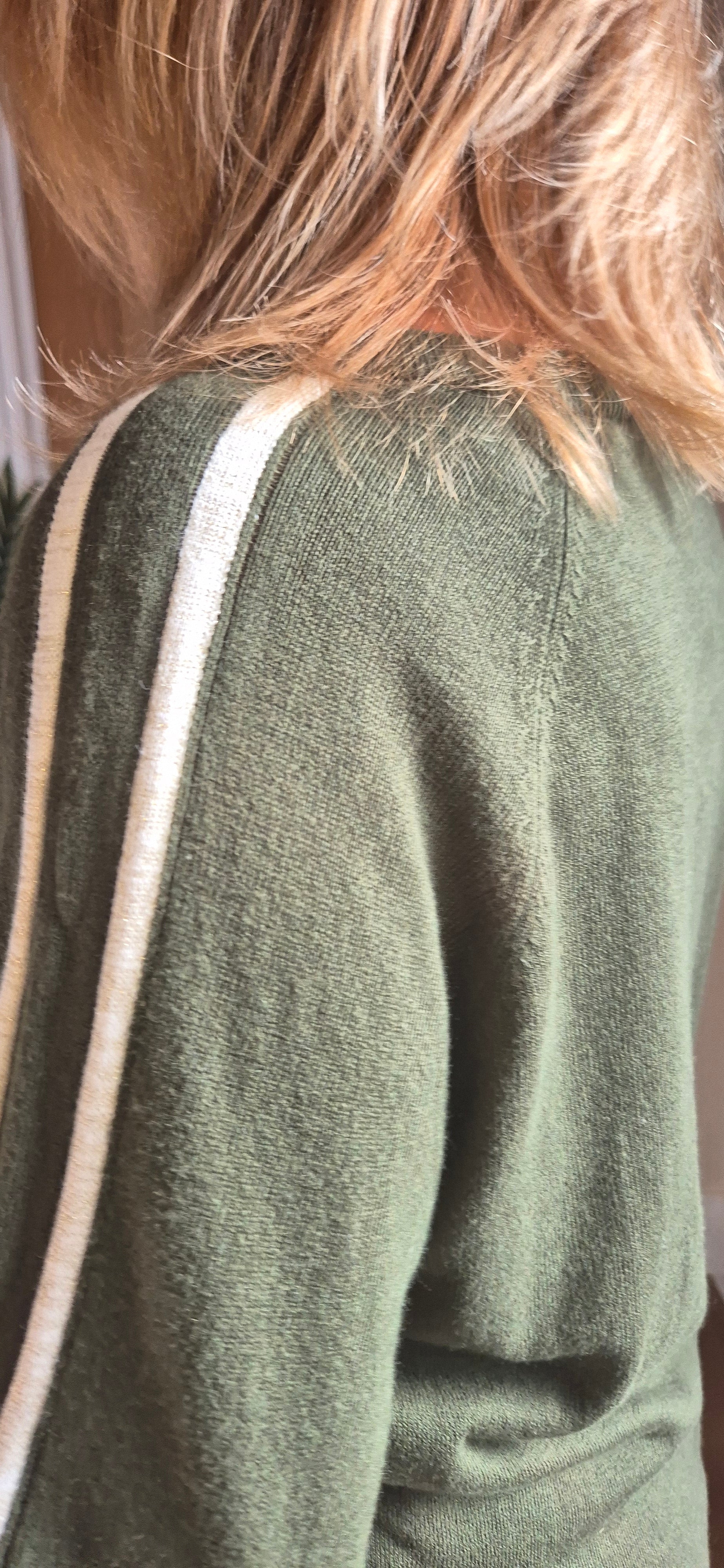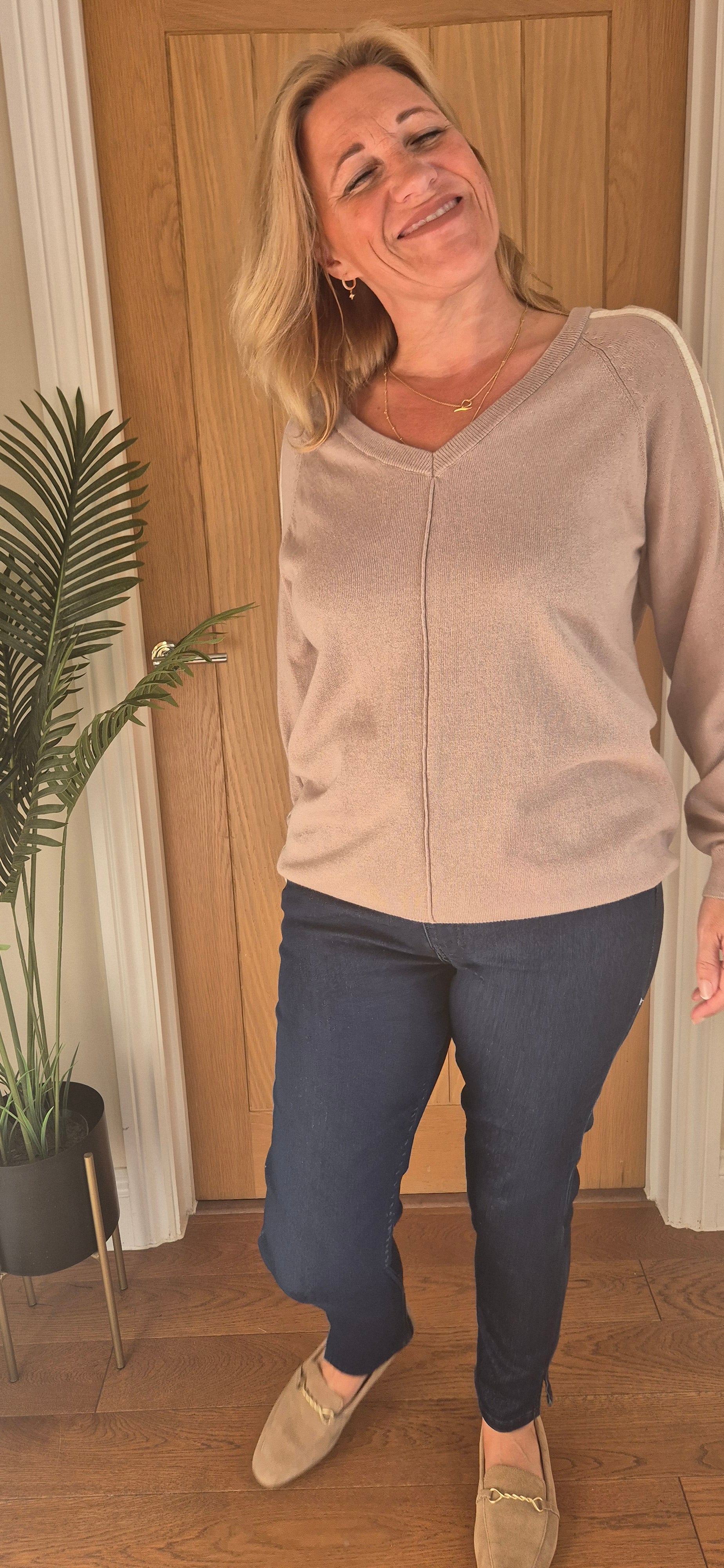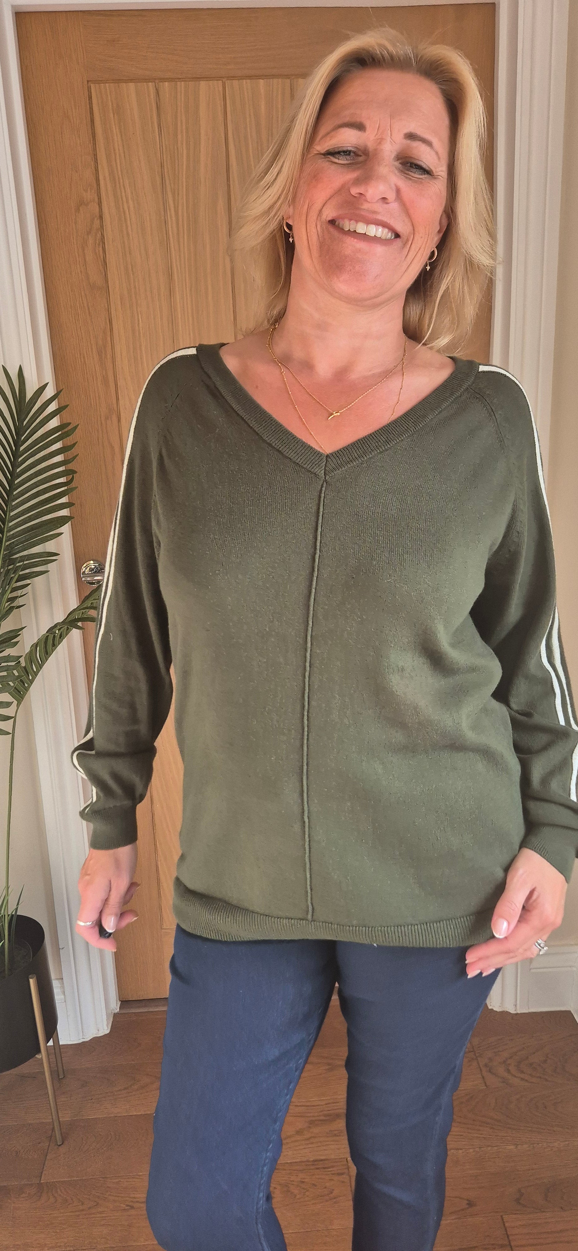 Effortless, casual, and stylish — the Talia Sweater is the perfect everyday knit. Featuring a classic V-neckline and subtle stripe detail on the sleeves, it adds a modern touch to any casual outfit.